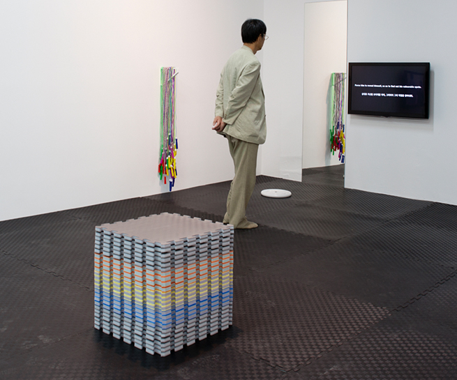 3 Channel HD Video, Sound Track, 155 C-Prints, Floor Mat, White Lift Weights, Jumping Ropes